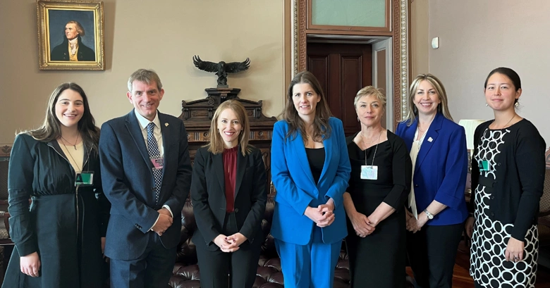 From left, Dr Elissa Redmiles, Georgetown University; David Wright, SWGfL CEO; Rachel Vogelstein, Special Assistant to the President and Deputy Director, White House Gender Policy Council; Michelle Donelan, UK Secretary of State, DSIT; Susie Hargreaves OBE, IWF CEO; Michelle DeLaune, NCMEC CEO; and Dr Rebecca Portnoff, Thorn, at the White House roundtable.