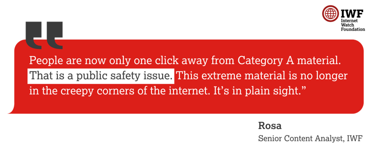 “Last year, we saw more of the most extreme kind of content online than ever before. Category A imagery can include some of the worst sexual acts being carried out against children.”
