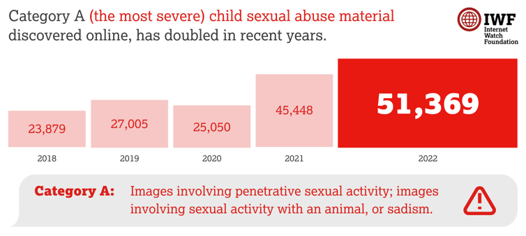 The amount of this kind of content has doubled since 2020 when the IWF uncovered 25,050 pages containing Category A abuse. The total number of URLs in 2022 containing Category A child sexual abuse material is higher than the IWF has ever seen before.